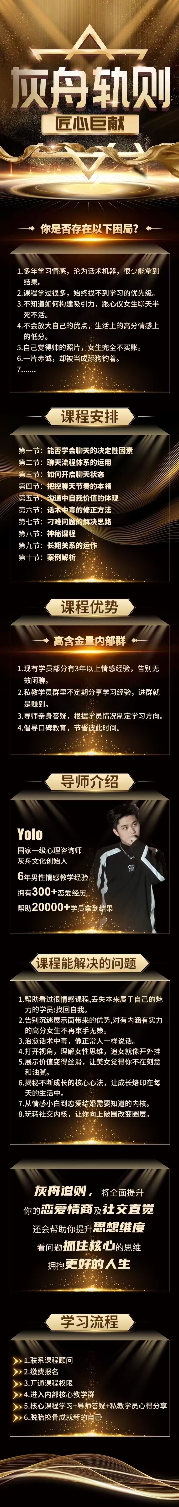 课程介绍:《灰舟轨则》是一门聚焦于“术法”的进阶课,从聊天技巧的精准升级;相处节奏的主动掌控;解除自我限制,当技巧成为本能,思维成为习惯你会发现两性关系的核心,从而形成完美吸引